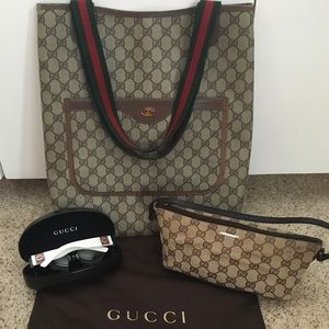 Five piece Gucci set. Each available separately in my closet. Please see other listings for more additional photos of each piece. TOTE is 8/10 condition, same for the CLUTCH. SUNNIES glasses are new, never worn but the glasses case shows wear. Dust bag for the sunnies still has the original tags. TNT9307