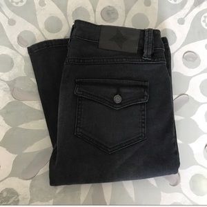 Distressed Black/Gray wash. Cotton Blend. Waist across is approx 14" laid flat. Inseam is approx 33". Front rise is approx 7 1/2". Measurements taken on Sz 25. Bundle for discounts! 5lb bundle weight limit. Thank you for shopping my closet!