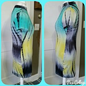 Gray, mint, and chartreuse tie-dye dress. Fully lined. Body con, snug style, very close-fitting, but stretchy. Very sexy! 95% rayon, 5% Spandex. Made in U.S.A.