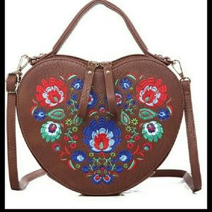 Get a dose of stylish glam with this heart shaped floral crossbody crafted from faux leather. Carry it by it's top handle or sling it across your body for chic hands free wear.