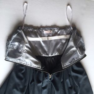 Stunning chiffon strapless dress from LaRok. Features a ruched and boned chiffon bodice and contrast mid-weight jersey skirt. Has sweetheart neckline and underwire cups. Functional exposed front zip and ruched waist. On-seam hip pockets. Boning and interior elastic bra strap at bodice for added comfort and stability. Fully-lined. Like new.