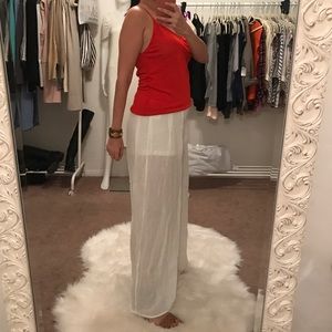Gorgeous Lightweight Off White High Waist Palazzo Pants. So chic and lightweight a necessary piece for the season. Super soft rayon material. Measurements- Small- Inseam 29", 40." Full Length, Waist 14". Medium- 29" Inseam, 40" Full Length, 15" waist. Large- 29" Inseam, 40" Length, 16" Waist. Partially lined, depicted in photo. Machine wash cold, do not bleach, Tumble dry low, do not iron.