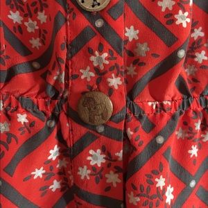Lovely 100% silk Anthropologie dress by Moulinette Sœurs. The skirt portion is lined, it has pockets and adorable wooden buttons. The button at the waistline has a darling rocking horse on it. The sleeves have a keyhole and ties. No damage or defects.