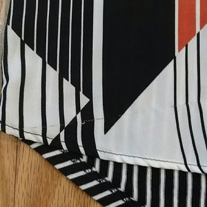 Cute flowy top in black,orange, and white with a cool design on front and back of top in size large. On front lower side of top there is one tiny pull in material but not very noticeable. Top has been worn once!! Message me with any questions!