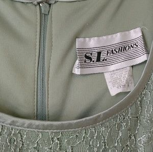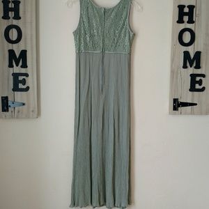 This a beautiful vintage dress with a shimmering lacey flower designed top and a runched flowing bottom. Like new condition from a pet and smoke free home. Polyester and nylon material Size 8. MEASUREMENTS laying flat approx: Pit to Pit 16.5 inches, Length 49 inches, Hidden Zipper in the back 20 inches. Beautiful light olive green/mint mixture in color. Photos taken inside and outside. (Vintage tag rn# 67563) #310