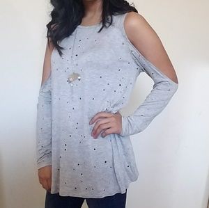 Gray perforated cold shoulder long sleeve top. Not form-fitting. I'M IN LOVE. Super soft and lightweight knit material. Fits TTS.