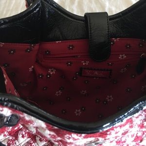 Vera Bradley handbag , red and white hounds tooth, black patent detail piping and handles, inside liner is red with pretty flowers, three pockets on the inside, one with zipper, the other for phone or whatever