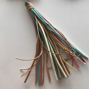 Absolutely stunning! Wood Beads/Multi Colored Shimmer Beads & Natural Tone Beads make this set a must have. Amazing quality. Suede Multi Colored Tassel detail with Shimmering Gold, Rose Gold & Yellow Gold Fabric Tassels. Gorgeous!