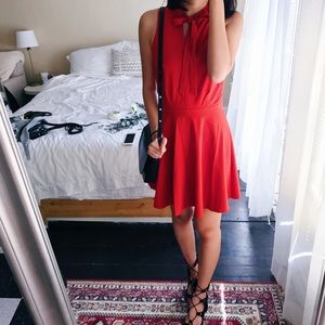 Ultra romantic and feminine dress with pussy-bow tie front. 100% polyester. Lining is 95% polyester and 5% spandex.