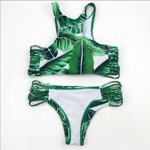 Super cute bikini!!! Top is fully lined with removable padding, cut out strappy sides and a racerback. Bottom has normal coverage, and cut out straps at the sides. Runs slightly small depending on body type. Only selling as a set. I'm a 27 and wear a LG bottom. 36DD and the LG top sadly is too small. ALL SWIM FINAL SALE