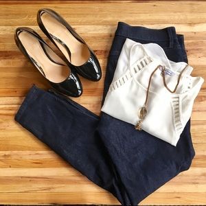 Beautiful genuine black patent leather Cole Haan heels. Slight platform measuring .75 inches under ball of foot. Nike Air soles. Size 7 1/2 B and heel height is 3.75 inches. Very little visible wear other than some damage towards the button of both heels at the bottom (pictured). White flowy top isalso for sale. I offer 15% bundles of two or more items!