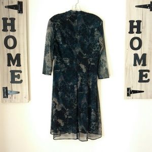Gorgeous dress with small mesh like designed fabric. The sleeves are sheer and the top is low cut criss crossed and unzipps in the back to the waist. Shell 94% polyester & 6% spandex, Lining 100% polyester Size 10 from a pet and smoke free home. Bottom of pit to bottom of pit/ chest is 17.5 inches but also has stretch so could fit bigger ( measured laying flat) top of shoulder to bottom of dress is 38 inches, and 12 inch sleeves #33