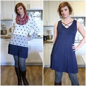 This lovely dress has criss-cross binding at neckline. This dress is made with soft knit jersey and drapes well. This dress is simple, yet stylish. It even has pockets!