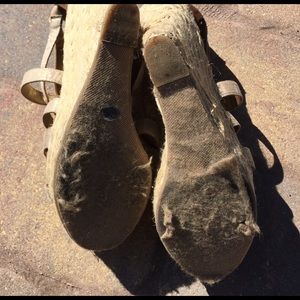 Brown Leather heels gold straps criss cross to the back with heel zipper woven fabric tan Wedge heel 4 inches