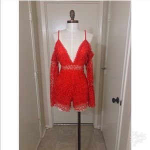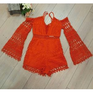 Orange-Red Romper made of crocheted lace fabric with spaghetti straps. V- neck with butterfly sleeves and a open back detail. Fab romper for day or night with concealed zipper.