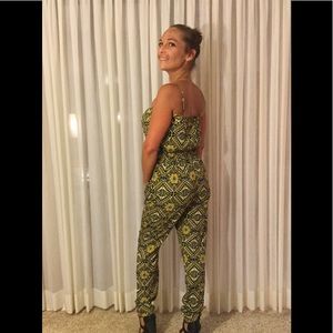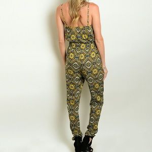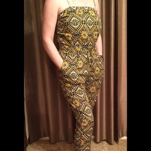 NEW Boutique Item - Beautiful multicolored print jumpsuit in brown/blue/gold & yellow colors. Very unique design. Truly a one-of-a-kind! Features adjustable spaghetti straps, smocked tie waist, lined top and side pockets. 100% rayon. Loose fitting makes this extremely comfortable. Just step into it. No messing with buttons or zippers! Elastic band at top. Top is lined so no need to wear a bra! NWT boutique item. Looks great in any size! Model is wearing a medium.