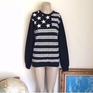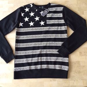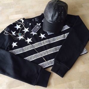 Black long-sleeve, crewneck sweatshirt w/ white American flag print all over the front. Stars on the top right & alternating stripes of black & a swirly Greek Key pattern all the way down. Back is plain black. This is a Men's XS from Forever 21's Men's line, 21Men, so it has a great boyfriend, oversized style & fit. SUPER comfortable, SUPER soft, & BRAND NEW!! Tag still attached!! **Necklaces & hat are not included** [14]