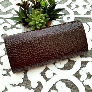 Cute clutch with chain strap. Great for nite out with beau or girlfriends! Shiny Brown answer silver. Big enough to carry all necessities. Strap detachable.