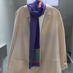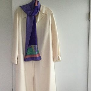 Glamorous vintage Linda Allard Ellen Tracy off white unlined Spring coat . Two front pockets, high slit in back . 💯 % wool . Excellent condition. No stains , pulls etc . Only a crease line at the collar and sleeve cuff. Worn once or twice Approx. 42 in L