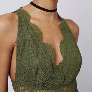 Perfffff for festivals! Crafted in a beautiful olive, this bodysuit features a plunging neckline and pretty lace with scalloped detailing to the bodice and neckline. 100% polyester. US size 4, but fits more like a US size 2. NWT.