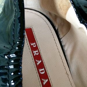 Beautiful classic PRADA Ballet patent leather flats with bow and metal Prada logo on each shoe. Very lightly worn, almost no wear, some light marking wear on inside, see picture 6, in really good overall condition! 🌸☺️
