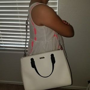 Kate Spade Leighann Laurel Way. In extremely great condition. Satchel shoulder bag with gold toned hardware. Main compartment has open top with magnetic tab snap closure; Top zip closure pockets in front and back Interior features custom fabric lining, 2 slip pockets, and 1 zip pocket Approx. dimensions: 14 in (L) x 10 in (H) x 6.5 in (W) Dual leather handles with a drop of approx. 4.5 in. Removable, adjustable shoulder strap with a maximum drop of approx. 17.25 in. Smoke free home. TV 300