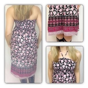 Be pretty, feminine & right on trend when you slip on this beautiful floral halter tube tank dress. Smocked & stretchy chest, halter tie with a tunic silhouette. Black with shades of pink & blush. 100% rayon. slip