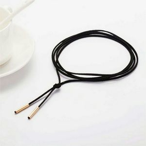 Trendy in all seasons; Black leather velvet wrap lariat choker necklace with silver & gold tone femme vertical tube ends