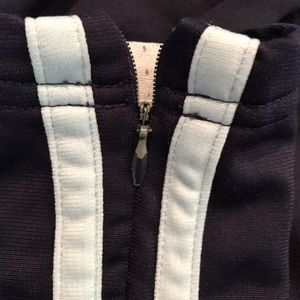 Navy track pants with baby blue double stripe down the leg on both sides. Tags removed but they are a small.