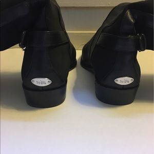 Traditional style riding boots. Leather front and stretch nylon in the back with leather stripe up the back. Silver buckle and logo at bottom as shown. Some knicks on front and back of left boot as shown. Works for people who wear a  wide calf boot if you wear them with tights or leggings. Worn less than five times. Height is 17 inches. Shaft circumference is 14 but can stretch.