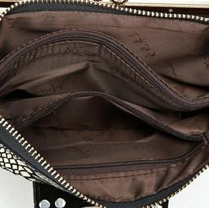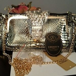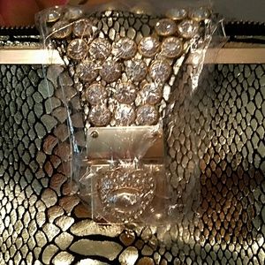 100 PERCENT GENUINE LEATHER BAG ROUGHLY 9 INCHES LONG BY 5 INCHES HIGH DETACHABLE 25 INCH STRAP ALSO SMALL SIDE STRAP WHICH IS ALSO DETACHABLE TO BE USED AS A CLUTCH HEART KISS LOCK CLOSURE Bag is gold with Crystal embellishments FRONT lock outer pocket brown interior inside middle zip pocket interior wall zip pocket very unusual a show stopper PRICE FIRM unless bundled no trades