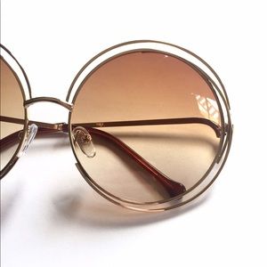 SO PERFECT FOR SUMMER! These sunglasses are the perfect addition to make all your summer outfits the most epic that they can be. Penny Lane will have nothing on you. Double gold frame around large round lenses. Brown/gold color.