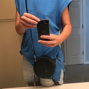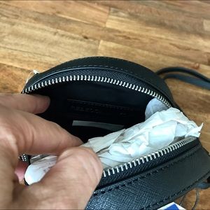 Beautiful RM Top-quality leather round cross body bag, Brand New with Tags! 24" adjustable strap. Edgy design is complete by perforated front details and wristlet strap. Measurements : 6.35"X 2"
