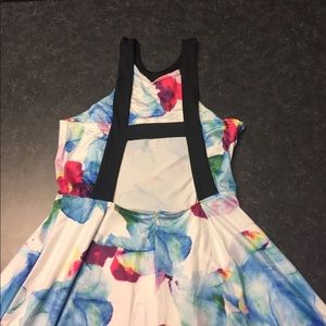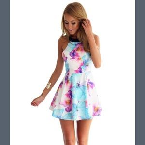 Lovely Flower Print Mini Sundress. Open back. Zipper closure. Gorgeous to wear alone as a super mini dress, or to pair up with some cute black leggings and heels. Perfect for the spring and summer!