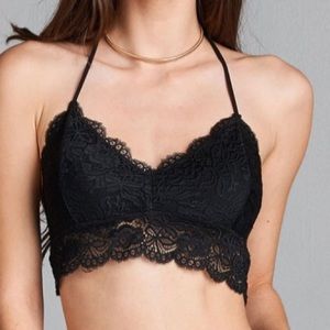 Ivory Lace Bra top w/ a T-bar back. Form fitting silhouette and front spaghetti straps connected to the lace fabric on the back makes it very sexy. 90% Nylon, 10% Spandex. Machine wash. Sizes small - large. Very stretchy. So pretty and well made. Pair with any summer tanks to be festival ready! (Photo of model in the black for fit/style reference only, color is Ivory)