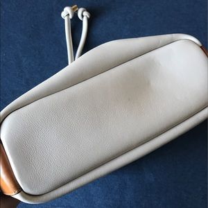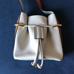 Chloe " Emma" leather bucket bag in beige color. Half of the strap is orange and the other is light brown. In great condition. Slight wrinkles and scratches on the bottom. Slight red marks on the pouch that goes with the bag. All as shown in pictures.
