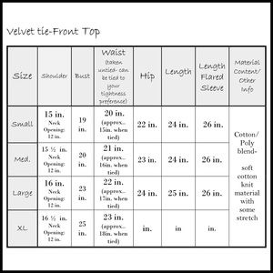 Tie-Front Off-the-Shoulder; off-the-shoulder cut , can also be like a boat neck neckline; high quality velvet; color is closer to a mocha color with slight under tones of blush purple (though definitely a brownish color); has a roomy fit; please see measurement chart to assure size. @A1