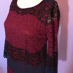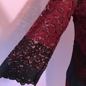 Brand new with tags never been worn before. Lovely lace detail all over with layers of wine, blue, and black. See through knit bell flare sleeves. Fully lined underneath. When laid flat - measures about 18 inches from armpit to armpit and about 35 inches in length from shoulder to hem.