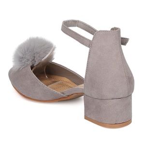 These gorgeous dress pumps are made with soft velvet body, pointed toe, and adorable pompom ball applique at vamp, single sole with a nice short stiletto heel. Closed Toe style with a wide, adjustable ankle strap. Wide, chunky heel for easy stability. First picture shows the same shoe just different color.