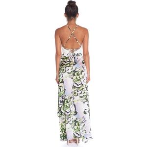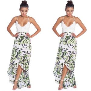 New impressive flowing amazing ivory green print dress in 100% polyester. With lace top.