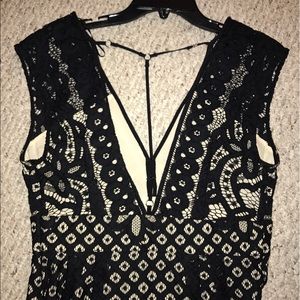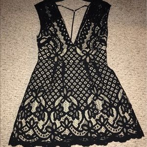 ⚡️FLASH SALE⚡️NWT 💙FREE PEOPLE 💙" One Million Lovers" Black Deco Lace Sleeveless Mini Dress. All over Lace overlay with contrasting Lining. Hidden Side zipper. Measures 23" from underarm to edge of scalloped bottom. Plunging Deep V-Neck. V- Back with T-Strap. Cotton / Rayon. Original cost $128