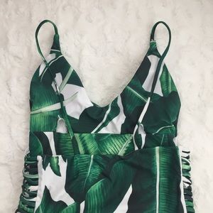 Swimsuit season is calling! Lounge under the palm trees in this blogger-worthy one piece. Allover banana leaf print evokes an island vibe. Padded cups, strappy sides, dipped back, cheeky cut. Suit runs on the smaller side, please see measurements as posted in last picture. Bust and waist measurements posted as same but bust can fit larger around because of open back. (*Not recommended for cups larger than a C*) NO MODELS, NO TRADES.