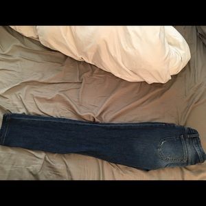 Lightly distressed, medium wash, size 28, skinny jean. I'm 5'4 and had them hemmed. Perfect condition- only worn 2 or 3 times.