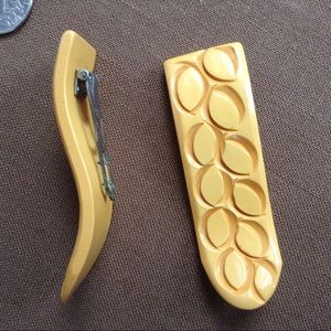 Terrific matching pair of large buttercream Bakelite dress clips. Carved with a lovely vine leaves motif. Naturally, they cannot be exactly alike and there appears to have been a slip of the knife on one leaf (see last pic). An original flaw which endears these to me even more. Unusual S curve. Clip marked "made in USA". A generous 3" long & 1" wide. I read that this color was called "creamed corn" in the 30's. These are in superb vintage condition and are ready to be proudly paraded again.