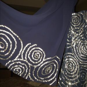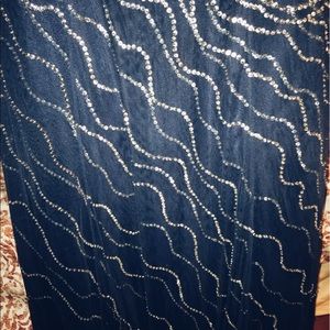 Gorgeous navy blue beaded floor-length evening gown. Comes with beautiful gossamer scarf with matching embroidery at the ends. Very eye catching and classy!!!