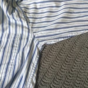 Slightly used, Allen Solly, blue and white striped button up shirt. The white is still vibrant with little discoloration and no pit stains. Please examine the pictures, what you see is what you get. If you would like more or specific pictures please ask! Men's size small.