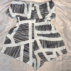 Summer Romper Playsuit fun and flirty Strapless Pockets Geometric design. Dark charcoal gray and white. This Romper has sticky rubber on the inside top band to help hold it up. Zipper in back. New in package. Stunning design.
