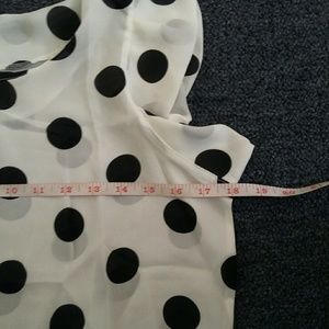 Adorable black and white polka-dot chiffon blouse. The blouse is semi sheer you will probably need a camisole underneath. It has a ruffle sleeve. Classic neckline. I have size large and size small. Measurements are in the photo gallery. Please note these do run small. Please message with any questions. Thank you for visiting my castle.