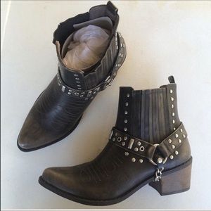 Western with an edge. This ankle boot features a topstitched vegan leather upper with a distressed finish for an authentic vintage look. Stud embellishments and a chain strap. Ankle height. Gored shaft. Shaft height: 5" Shaft circumference: 11" 2" Cuban heel. Pointed toe. Padded insole.