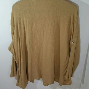 ** Sold Locally! ** This is a nice top, great shape, light and airy for summer! Wear buttoned down or open over a white tank top. Pairs with jeans or skirts. Has straps and buttons to hold sleeves rolled up. Beaded in the front with pretty brown wood beads.